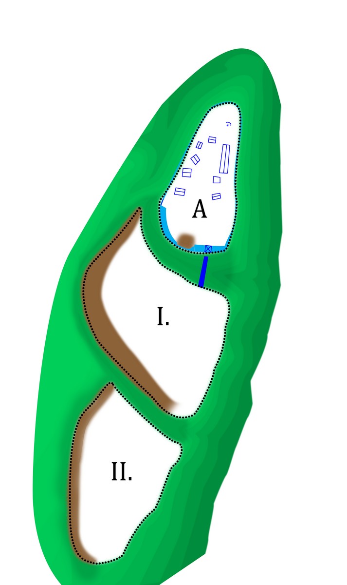 The lowest-situated part of the settlement is the second outer bailey where the settlement has been least intensive. The rampart encloses this area at a length of 150 m on the western side, but does not continue towards the south and southeast and does not reach as far as the eastern steep slope. Taking into consideration that the ditch also is shallow and indistinct here, it has been supposed that this part of the fortification was not finished.