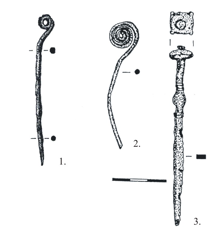 However, throughout the Slavic world we can find such a wide spectrum of jewellery that it is not possible to describe all types. Among the most frequent personal ornaments are earrings, usually made from bronze or silver, rarely from gold, and sometimes only silvered or gilt. An assemblage of 15 scorched earrings from our hillfort refers to Great Moravian style and indicates a strong influence of Great Moravia on Chotěbuz after its being conquered. In the Great Moravian environment also occurred buttons, that is decorative spherical ornaments intended for fastening clothes together, various types of pendants, and strap ends which often were very richly ornamented – however, none of these objects were found at Chotěbuz. Typical Slavic ornaments of the mid-10th to 12th centuries were lock-rings, usually those with S shaped loop, which were applied to a headband or woven into hair. From Chotěbuz we know a silver specimen.